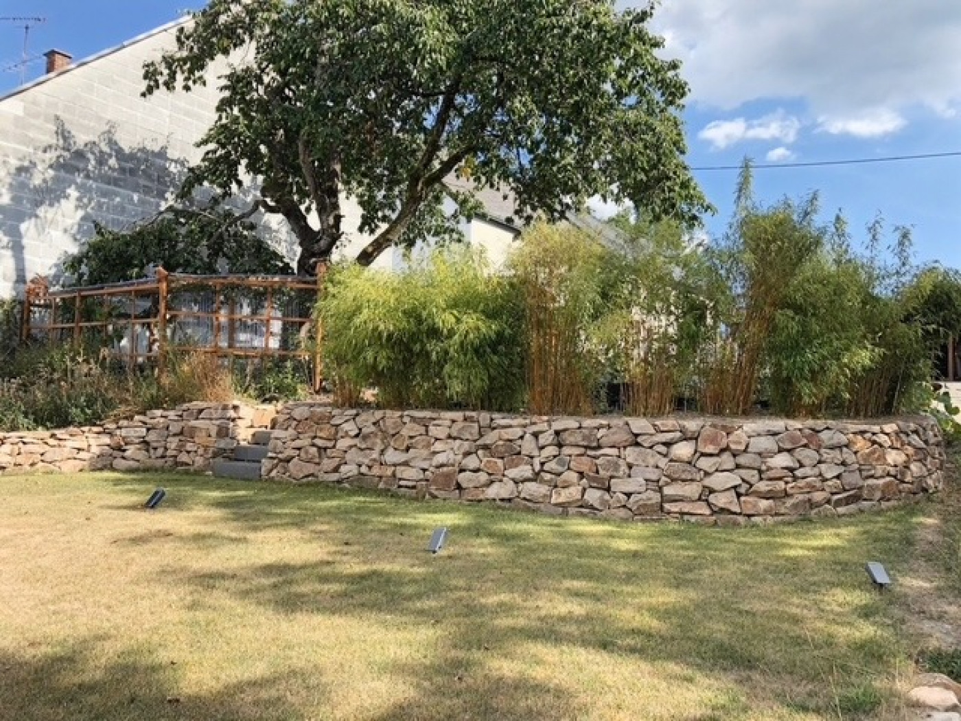 Der Garten wurde 2021 komplett neu angelegt und mit rund 45 Tonnen Naturstein liebevoll gestaltet. Harmonische Mauern,